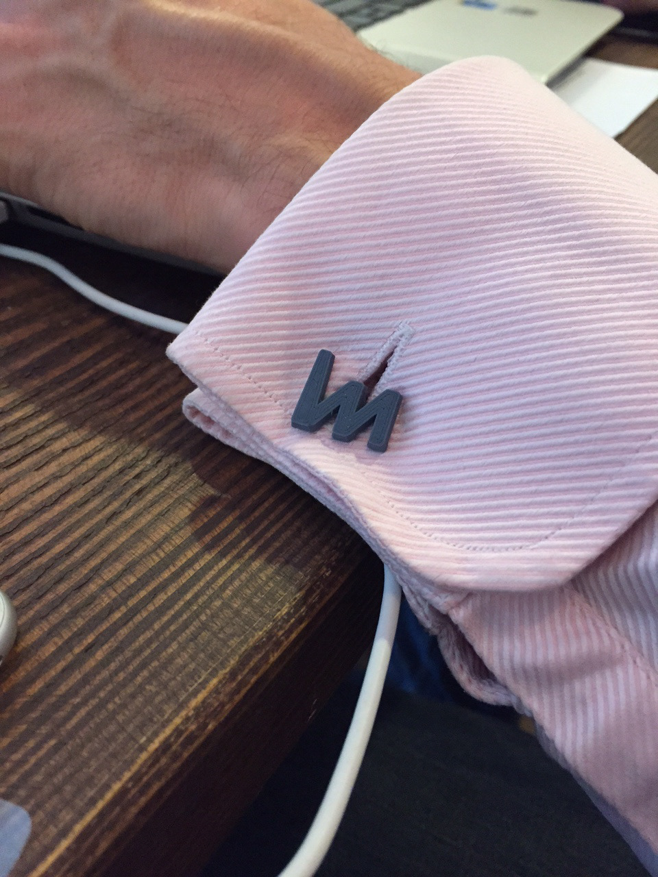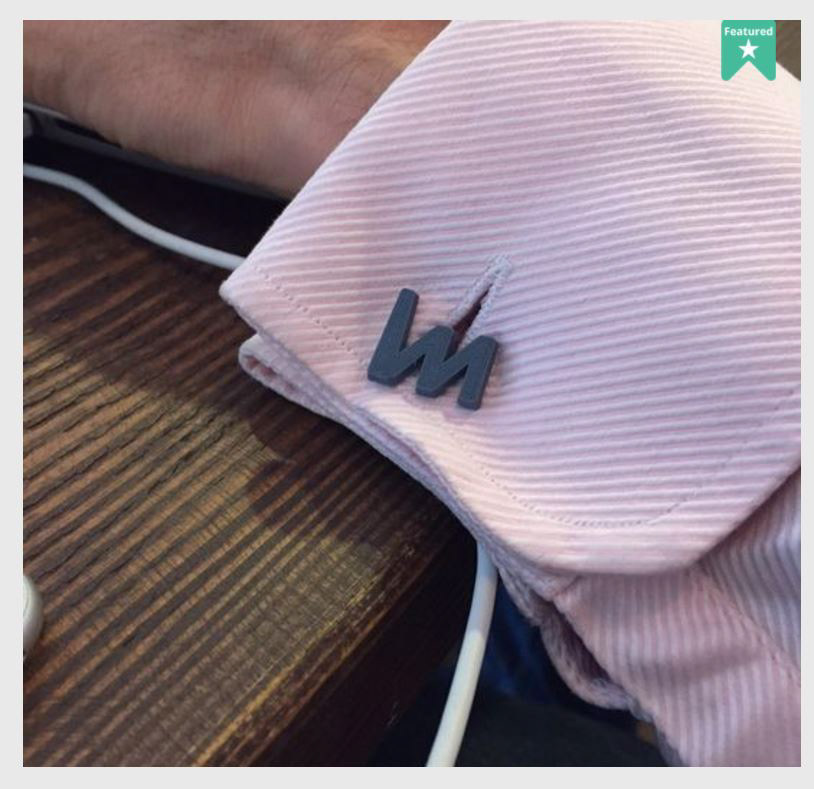 3D printed cufflinks printed in PLA on an Ultimaker2 with the iMakr logo made for iMakr's founder, Sylvain Preumont. Featured on My Mini Factory. (2016? 2017?)
