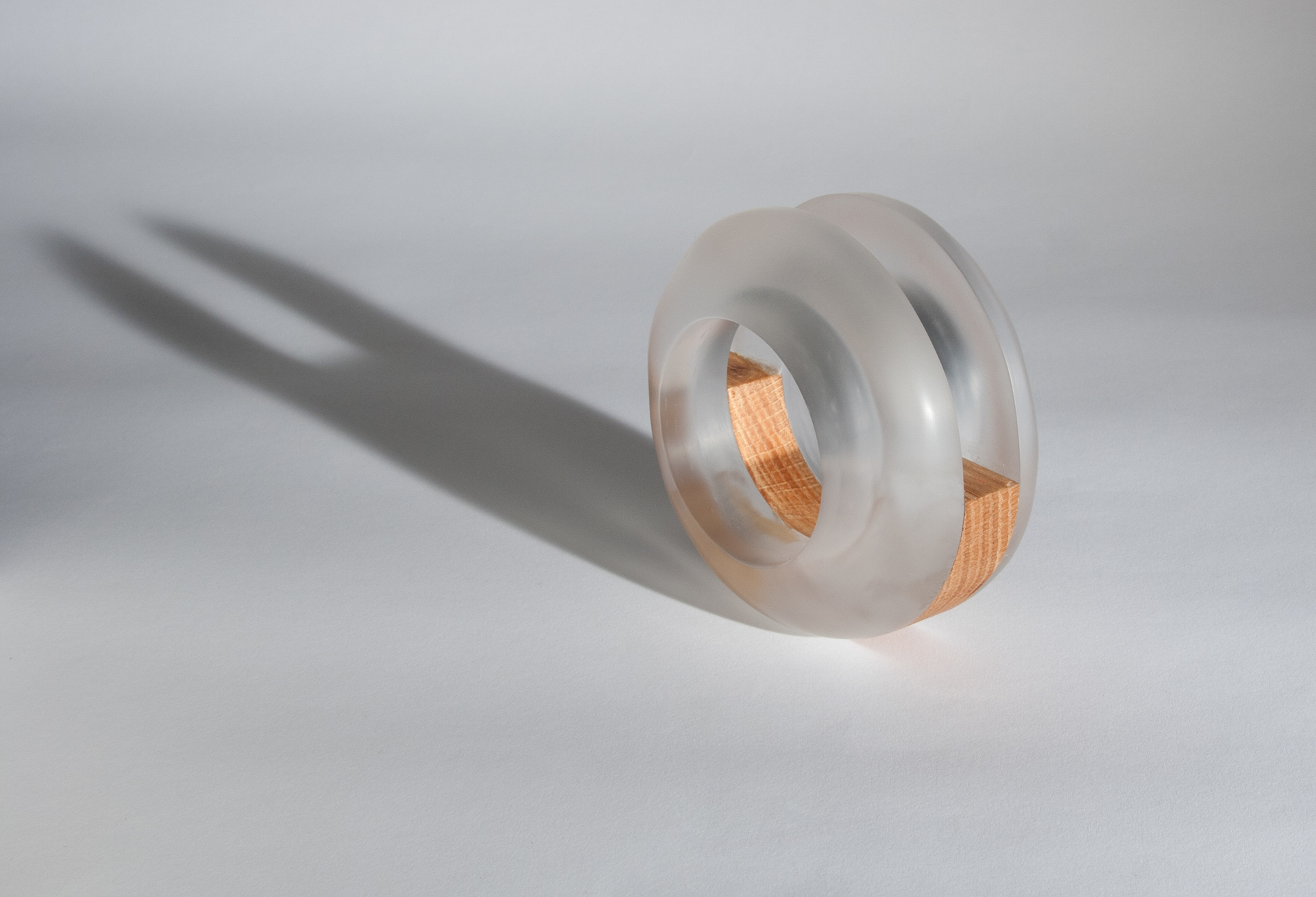 An oak and colorless acrylic cuff shaped with a belt sander.